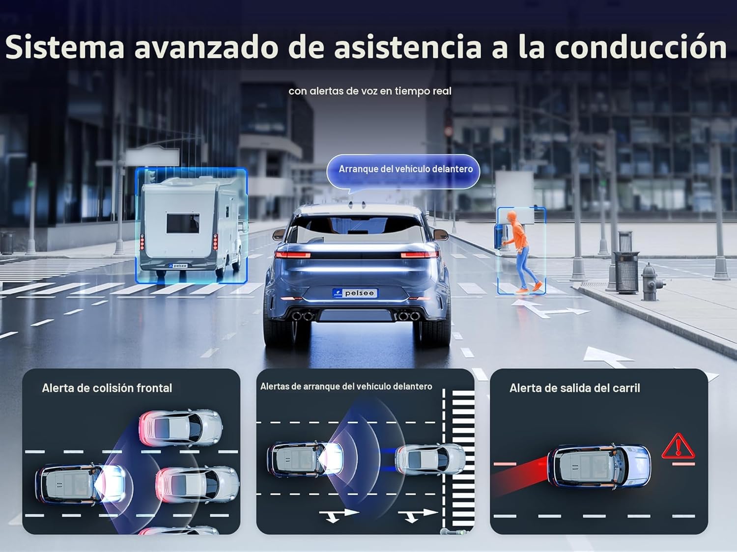 Alertas avanzadas ADAS (sistema avanzado de asistencia al conductor): el espejo retrovisor digital pelsee está equipado con tecnología ADAS avanzada, proporcionando alertas de voz para escenarios críticos de carretera como arranque delantero del vehículo, salida de carril, colisión hacia adelante y detección de peatones. Manténgase consciente, reaccione más rápido y conduzca más seguro con asistencia en tiempo real
