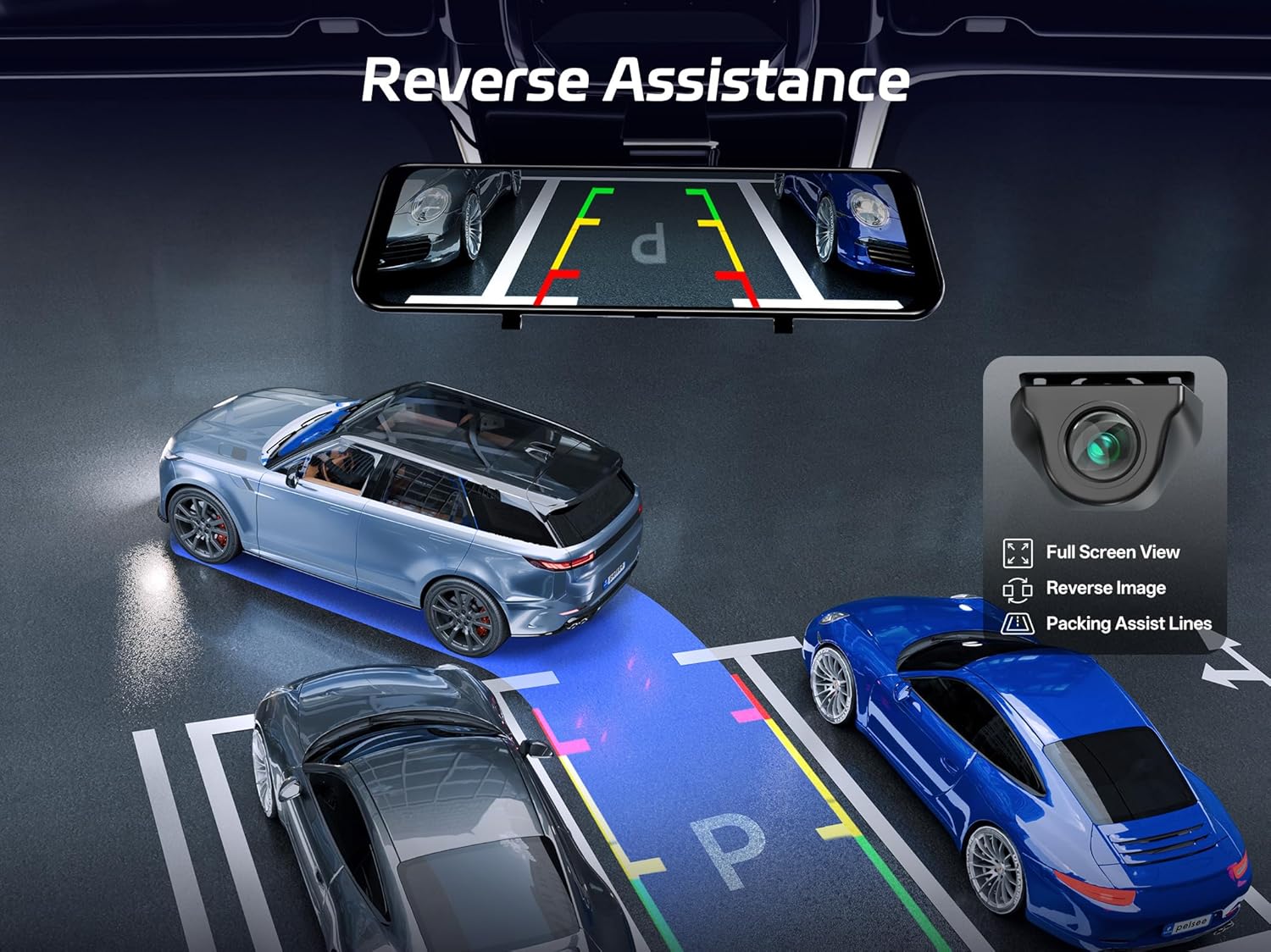 Ayuda de marcha atrás segura: cuando cambias a marcha atrás, tu espejo retrovisor inteligente pelsee cambia automáticamente a una vista trasera 1080P en tiempo real con pautas de estacionamiento dinámicas. La lente gran angular de 160° y la visión nocturna garantizan una visibilidad clara de día o de noche, mientras que las alertas audibles advierten de obstáculos cercanos para un estacionamiento más seguro