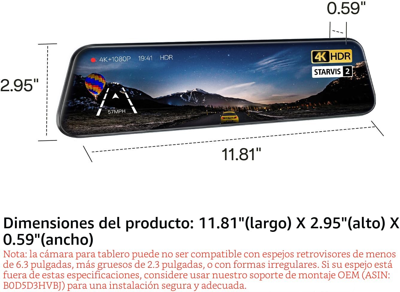 Excelencia en grabación dual 4K+1080P: Capture imágenes ultra claras de 4K a 25fps con la cámara frontal y 1080P@25fps detallados con la cámara trasera. Equipado con un sensor STARVIS 2 y tecnología WDR trasera HDR frontal, esta cámara de tablero de espejo retrovisor ofrece una calidad de imagen superior, placas de matrícula de representación nítida, señales de tráfico y detalles críticos de día o de noche