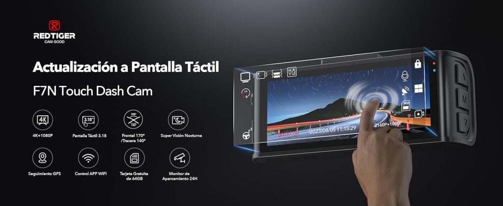 [Control de voz y pantalla táctil] La dashcam F7NTOUCH cuenta con comandos de voz, lo que permite el control sin manos de tu cámara de auto 4K, lo que mejora la seguridad al minimizar las distracciones. La cámara de tablero dual también tiene una pantalla táctil inteligente que puede bloquear el video de emergencia, activar el wifi y capturar escenas con un solo clic. Redtiger también conserva los botones, se integran múltiples métodos de control.